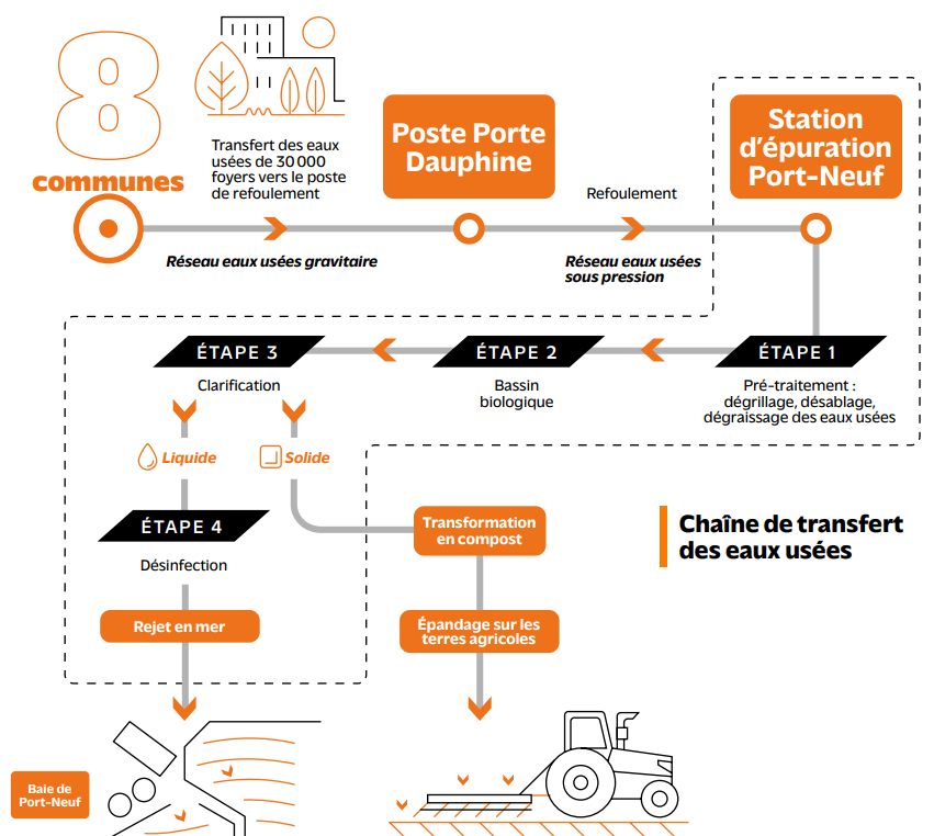 Le poste de refoulement* des eaux usées de la Porte Dauphine est le plus important ouvrage de transfert des effluents du territoire, et se révèle donc vital pour le fonctionnement général du réseau de collecte des eaux usées de l’Agglo : il collecte l’équivalent des rejets de 30 000 foyers provenant de 8 communes (sur les 70 000 foyers que compte l’Agglo) et assure le transit moyen de 13 000 m3 d’eaux usées par jour jusqu’au pôle épuratoire de Port-Neuf.